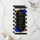 Menükarte. Klassisches Schwarz-weißes königsblaues Design mit Imitaten Glitzer Gold. Schwarzweißstreifen mit blauen Rose. Ideal für ein elegantes Party.