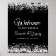 Modernes Black Wedding Welcome Sign Poster bietet hellgelbe, elegante Schrift mit Kaskade silberner Konfetti.