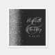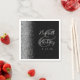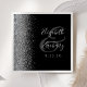 Die links Hand dieser eleganten, modernen Hochzeitsnapkins besticht durch ein silbernes Imitat-Glitzer-Design. Der anpassbare Text kombiniert silbergraue Handschrift und Copperplate-Schriftart auf einem großen Ampersand auf schwarzem Hintergrund.