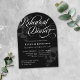 Elegante Hochzeitsdinner mit einer Kombination aus eleganten klassischen Schriftart und einem verzierten Drehbuch mit vielen Wirbel auf schwarzem Hintergrund mit dunkelgrauen Schädeln. Mit diesen goten Einladungen zum Thema "Probe" laden wir Ihre Hochzeitsgäste zum Abendessen ein.