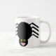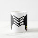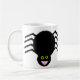 Eine Tasse mit einer schwarzen Spinne mit acht haarigen Beinen, gelben Augen mit großen schwarzen Pupillen und einem offenen Mund mit ihren Reißzähnen.