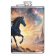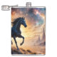 Wild desert black stallion running in a lightning storm, with colorful skies, full of stars and nebulae