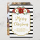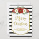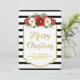 Joyeux carte photo de famille de Noël avec nom personnalisé en noir et blanc rayures motif avec cadre doré et texte et fleurs vintages rouges.
