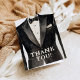 Merci à vos groomsmans d'avoir participé à votre journée de mariage ! Carte de remerciements pliée, costume noir et blanc avec blanc à l'intérieur.