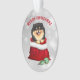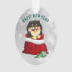 Ein zauberhafter kleiner Schwarz-Bein-Spitz Pop aus einer roten Geschenktasche vor diesem Weihnachtsschmuck. Ein paar aquamarine und goldene Muster Holiday Baum Glühbirnen liegen direkt vor der Santa Tasche.Der Text über dem Bild sagt "MERRY CHRISTMAS" in rot. Das Bild und der Text werden auf einem silbernen abstrakten Hintergrund platziert. Die Rückseite des Ornaments hat das gleiche Bild, aber mit dem Text "HAPPY NEW YEAR" in aquamarinem Grün.