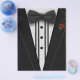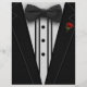 Ein schwarzer Smoking mit einer Bogen-Krawatte und rote Rose.