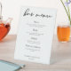 Einfach schick und stilvoll präsentiert sich unsere minimalistische Hochzeitskollektion mit eleganter, kursiver Typografie für Ihre moderne Veranstaltung. Beeindrucken Sie Ihre Gäste mit einem formellen Abend Hochzeitsmenü Bar Podestal Schild mit schwarzem Schrift auf einer fetten Getränkekarte.