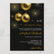 Black wedding invitation with gold text and glittering ornaments. Fireworks and baubles convey a festive New Year’s Eve theme. Elegant and celebratory.