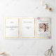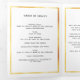 Un programme triplé élégant. Un arrière - plan blanc, un cadre en faux or, des fleurs roses et blanches et un espace pour une photo. Personnalisez et ajoutez le nom, les dates et votre texte.