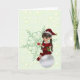 Ein niedlicher kleiner Elf, ganz in Rot gekleidet, mit Glocken auf den Zehen. In der einen Hand hält sie ein heiliges Spray und in der anderen ein Weihnachtsschmuck. Sie sitzt auf einem Winterorb vor einem schneebedeckten Hintergrund. Sie können dieser Karte Text hinzufügen.