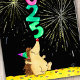 Diese Neujahrskarte 2025 hat einen niedlichen handgezeichneten Igel, der einen gestreiften Party trägt und die Zahlen 2, 0, 2 und 5 auf der Nase ausbalanciert. Feuerwerke platzen vor einem schwarzen Hintergrund.