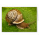 Diese leere Karte zeigt eine Gartenschnecke, die aus seiner Muschel auf einem grünen Blatt hervorgeht. Er ist ein Mollusk aus Erdgastropoden mit einer braunen und beigen Muschel im klassischen Spiralmuster. Seine Tentakel haben jeweils ein Auge am Ende und zeigen nach vorn, während er herausfindet, wohin er gehen soll, durch seinen starken muskulösen Fuß vorangetrieben. Eine kleinere Schnecke befindet sich im Inneren auf einem blassgrünen Gefälle.