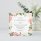 Elegante blumengeschmückte Einladungen mit Ihren Hochzeitsdetails, gerahmt von den blau-rosa Aquarell-Rose und Tulpen mit üppig grünen und kupfer Blätter. Die viereckigen, blumengeschmückten Einladungen kehren zu einem hellrot-rosa Hintergrund zurück. Entworfen, um mit unserer Blush Spring Bloral Hochzeitskollektion zu koordinieren.