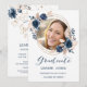 Graduation Party Einladung mit einem Rahmen von marineblauen Blumen umgeben ein Bild des Graduate. Auf der Rückseite - die Oberseite setzt mit einem Blume-Thema fort und hat auch goldene Wirkung Konfetti, und darunter - Einzelheiten des Party