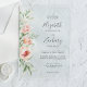 Die links Seite dieser romantischen Hochzeitseinladung besticht durch einen Blumenstrauß aus Pfirsich, blüschigen Blume und Grünpflanzen. Der anpassbare Text kombiniert handschriftlich, kopperplate und kursiv Schriftart in Holzkohlegrau auf einem transparenten Hintergrund.