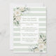 Diese Hochzeitseinladung präsentiert eine elegante Ästhetik mit einem Hintergrund von abwechselnd hellgrünen und weißen horizontalen Streifen. Die Ecken sind mit exquisiten Blumenarrangements geschmückt, die mit weißen Rosen, Hydrangeas und Eukalyptus geschmückt sind. Das Gesamtbild ist raffiniert und romantisch, der Text zentriert sich perfekt in einem grünen Serif-Schriftart und schafft ein harmonisches und zeitloses Aussehen.