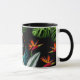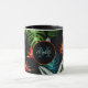 Ein schicker schwarzer Hintergrund. Der tropische Regenwald ist grün und blau, der Dschungel. Blätter aus Palmen und Bananen, Blattwerk mit roten und orangefarbenen Blumen, Blume. Ein schwarz-orangefarbener Rahmen mit Platz für Ihren Namen und Monogramm-Buchstaben. Der Name ist mit einem modernen handgeschriebenen Stilskript geschrieben.
