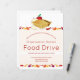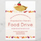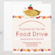 Ein Papierschild für ein Lebensmittel-Laufwerk, das von einer Organisation, einem Unternehmen oder einer anderen Gruppe gegeben wird. Dieses Lebensmittelschild verlangt nach nicht verderblichen und nicht veralteten Lebensmitteln. Es enthält Datum und Uhrzeit der Veranstaltung und den Ort. Es bietet einen lächelnden Apfelkuchen und farbenfrohe Herbstlaub.
