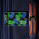 Die tropische Palmenblattkonstruktion ist grün und blau gehalten. Personalisieren Sie das Programm mit einem Namen auf der Vorderseite und einem Namen und einer Adresse auf der Rückseite.
