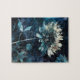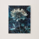 Ein wunderschönes Blau-Weiß-Blütenbild, das wie ein Print in der Sonne über Cyanotype mit gemischten Medien Tinte Spritzer Details aussieht.