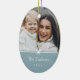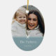 Die schlichte und ovale Weihnachtsschmuck-Einrichtung ist minimalistisch gehalten, mit dem Familiennamen und dem Jahr in einer gepflegten, klassischen Serifenschrift auf einem weichen blauen Hintergrund. Ein kleiner Bogen unter Ihrem Foto vervollständigt das Design.