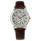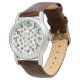 Diese Frauenuhr hat ein geometrisches Design aus blauen, grünen und braunen Punkten.
