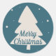 Dieser moderne Rundaufkleber ist mit einer weißen Kiefernblüte mit kleinen weißen Schneeflocken auf flachem, blauen Hintergrund ausgestattet. Die anpassbaren Worte "Frohe Weihnachten" sind in einem eleganten blauen Schriftart geschrieben