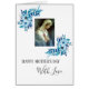 Das ist ein hübsches, traditionelles Bild der gesegneten Jungfrau Mary, die eine rosa Rose hält. Die blauen Sprays sind auf jeder Seite von ihr. Text und Schriftart können geändert werden.