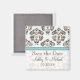 Personalisieren Sie diesen hübschen blauen und braunen Damast Brauch und personalisiert speichern Sie das Datum Magnet mit dem Namen der Braut und Bräutigam und das Datum ihrer Hochzeit. Design © Chrissy H. Studios, LLC. Alle Rechte vorbehalten.