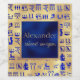 Dieses individuelle Weinflaschenlabel besticht durch ein altägyptisches Kunstthema. Eine Reihe von blauen ägyptischen Hieroglyphen werden auf einem Hintergrund im Stil von Goldfolie gedruckt. In der Mitte wird ein blaues Textfeld platziert.