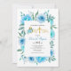 Blauer Aquarell Blume Taufe Blumen Einladung Junge. Dieses wunderschöne Design besticht durch einen Blumenrahmen aus blauen Blumen, prächtigen Blätter und Ihrem Text. Das Wort "Taufe" ist in Gold in einem dekorativen Schriftart mit Blumenstrauß, während der Name des Jungen in Schriftzypografie steht. Anstelle des Buchstabens "I" im Wort "Taufe" gibt es ein goldenes Glitzer Kreuz.