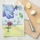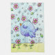 Whimsikale Aquarellmalerei eines niedlichen blauen Vogels umgeben von hübschen rosa Blume und grünen Blätter.