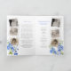 Beerdigungsauftrag zweiseitiges florales Delphinium Aquarellkunst-Programm mit pulverblauen Blumen und grünen Blätter auf Weiß. Ersetzen Sie einfach den Beispieltext und den Sofortstil mit gerahmten Foto-Halterungen in altem Stil und das weiche Foto vorne mit Ihren eigenen Fotos und Informationsdetails. Original botanische Aquarellmalerei und Design von Sarah Trett für www.mylittleeden.com (Fotos sind nur Platzhalter für Sie, um mit Ihren eigenen zu ersetzen).
