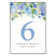 Summer Watercolor Design Tischnummern mit Pastellblau und Lavendel, Hydrangea, Weißrosen, Blumenmotiven und staubblauen Text auf weißem Hintergrund.