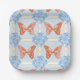 Blaue Hydrangeas und rosa und orangefarbene Schmet Pappteller