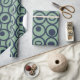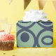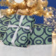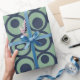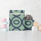 Dieses Verpackungspapier hat eine geometrische Form von Kreisen in Reihen mit Kreisen oder Ovalen in blau auf einem grünen Feld.