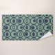 Dieses Handtuchhandtuch ist mit einem hellgrünen Waschtuch, einem blauen Handtuch und einem Badehandtuch mit geometrischer Gestaltung von Kreisen in Reihen mit Kreise oder Ovalen in blau auf einem grünen Set ausgestattet.