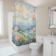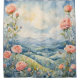 Blaue Berge in der Ferne und grüne Hügel im Vordergrund sind von üppigen, rosa Rosen auf beiden Seiten gerahmt.