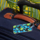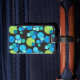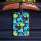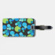 Eine lebendige doppelseitige, Acrylgepäckmarke mit einem abstrakten "Blue Moons"-Muster in heller Blues und Neon-Grün auf schwarzem Hintergrund; von Judy Adamson aus einer handbemalten Papierkollektion. Der Gurt ist aus Leder.