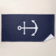 Modernes Minimalistisches Nautical Beach Handtuch mit weißem Anker auf marinebasischem Hintergrund.