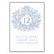 Circling Blatt Design monogramm Hochzeit Tischnummern. Fügen Sie Ihre eigenen Tischnummern mit einem, Name und Hochzeitsdatum in blau auf einem weißen Hintergrund. Andere Farben und passende Hochzeitsartikel sind erhältlich. © Original Blatt zeichn und Design von Sarah Trett für www.mylittleedenweddings.com auf zazzle.