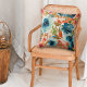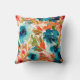 Hier ist ein wunderschönes Kissen mit einem Herbstblumenmuster in kräftig blauen, sanften Grün- und Orangenrot. Die Sterne im Muster sind wunderschöne blaue Rose, die warmen Blätter ergänzen sie. Das Muster wird auf einem weißen Hintergrund platziert. Die Rückseite des Kissens hat das gleiche Muster.