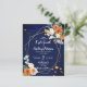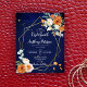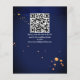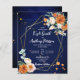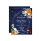 Orangefarbene und weiße Rosen Salbeieucalyptus grün marineblau Hintergrund goldener Rahmen Blumenrahmen Blumenkostauflage Hochzeitsvorlage mit QR UAWG code auf der Rückseite.