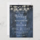 Diese blaue rustikale Stallenholz-Saitenlampe Hochzeitseinladung kann mit Ihren Informationen in der modernen Typografie personalisiert werden. Entwickelt von Thisisnotme©