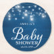 Dieser rustikale runde Untersetzer der Baby-Dusche kennzeichnet Lichter in den Maurergläsern und in den Schnüren der Lichter mit dem Wort "Baby-Dusche" gegen einen blauen hölzernen Musterhintergrund. Der Karo, der heraus Einzelteile zusammenbringt, mögen Einladung, Aufkleber und Briefmarken hier https://www.zazzle.com/collections/rustic_wood_mason_jars_and_lights-119202204970019494?rf=238364477188679314