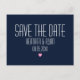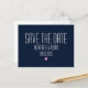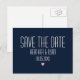 Navy blaue Postkarte Save the Date mit rosa Herz und weißem Text.