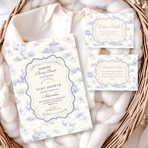 Ein süßes, vintage-inspiriertes Design mit zarten blauen Schleifen, weicher gestreifter Verzierung und charmanten Blaubeergarten-Illustrationen. Toile-artige Kunstwerke mit niedlichen Tieren und Obstkörben schaffen ein klassisches Märchenbuch-Feeling in einer weichen, pulverblicken Farbpalette. Der aufwendige zentrale Rahmen fügt Eleganz hinzu, während er den Gesamteindruck leicht, verfeinert und zeitlos hält. Perfekt für eine Babyparty mit einem sanften Gartenthema und einem Hauch von traditionellem Charme.
