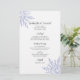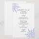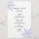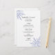Passen Sie das festliche Blue Snowflakes auf der White Winter Wedding Menu mit den Details des Essens, das Sie im Dezember, Januar oder Februar Brautparty Mittag, Probe Dinner oder Ehe Empfang servieren, indem Sie den Salat oder den ersten Gang, Vorspeise oder Zweitgang und Dessert oder dritten Gang hinzufügen. Personalisieren Sie es mit den Namen der Braut und des Bräutigams, dem Ort und dem Veranstaltungsdatum. Dieses elegante und individuell gestaltete Winterwunderland-Hochzeitsmenü bietet faszinierende blaue Schneeflocken an den Ecken mit weißem Hintergrund.