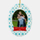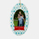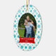 Diese ovalgeschnittene Weihnachtsfeiertags-Keramikverzierung hat einen weißen Hintergrund mit Losen blauen Schneeflocken ganz herum im Hintergrund. In der Mitte können Sie die Familienphotographie mit Ihren Selbst besonders anfertigen. Unter dem Foto gibt es eine rote und weiße Fahne, in der Sie den Familiennamen und das Jahr personifizieren können. Sie konnten den Text für das erste Weihnachten eines Babys oder sogar ein unser erstes Weihnachten für ein eben verheiratetes Paar besonders anfertigen!