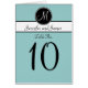 Einfache elegante Monogramm-Hochzeits-Empfangs-Tischnummer-Karten mit hellblauem Hintergrund, weißer Monogramminitiale auf einem schwarzen Kreisumbau und Braut- und Bräutigamnamen auf einem Schwarzweiss-Streifen. Fertigen Sie mit Ihrer wedding Tischnummer, Monogramminitiale, Namen und wedding Farben unter Verwendung Zazzles der bedienungsfreundlichen Menüaufforderungen besonders an. Dieser einfache dennoch elegante Monogramminitialenentwurf arbeitet für alle Buchstaben des Alphabetes und ist zum Anzug jede mögliche Farbkombination völlig kundengerecht. Um mehrfache Karten zu bestellen, ändern Sie die Zahl und fügen Sie ein Ihrem Wagen hinzu. Ändern Sie dann die Zahl wieder und fügen Sie Ihrem Wagen hinzu. Damit Sie die gleiche Zahl Aufträgen von einer Karte haben, wie Sie Tischnummern benötigen. Plan-Entwurf durch Elke Clarke ©.